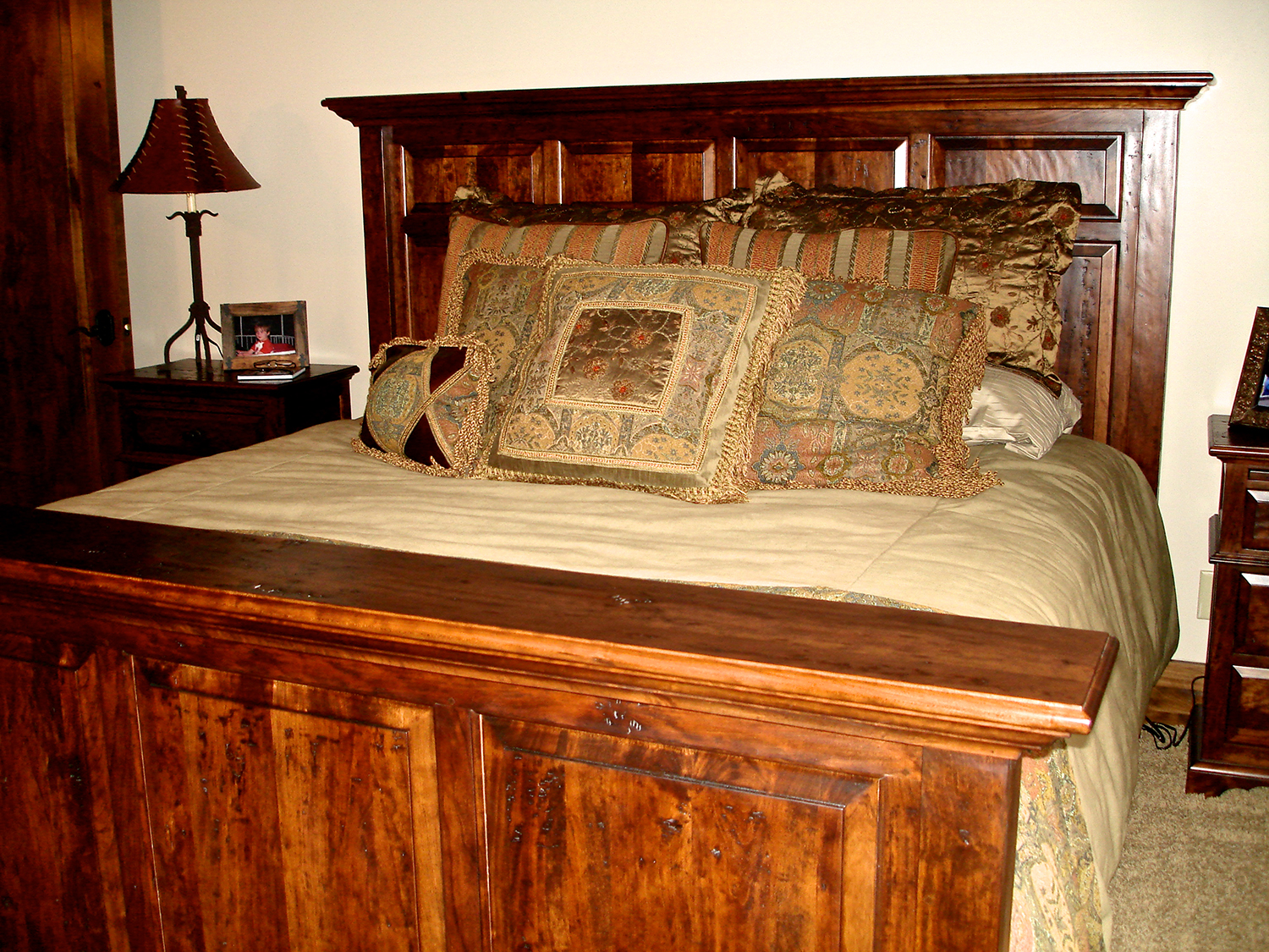 This is a stunning bed, just one of approximately 80 different furniture pieces made by these craftsmen. Their pieces evoke a hand-planed distressed style they discovered years ago in an old European Pub. Now, every piece of furniture they build, be it a dining table, television console, home office or cocktail table are all built out of wild black cherry wood and all behold this distinctive elegantly distressed appeal. Not all of their pieces are this dark. They offer a natural, medium or deep dark cherry as shown here.